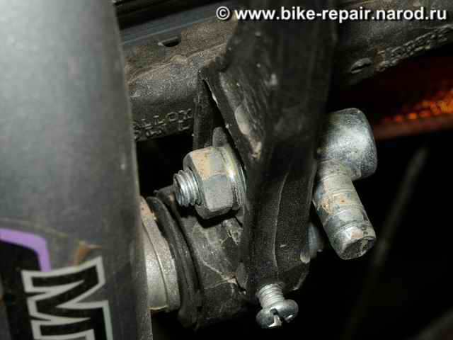 1. Ослабляем немного гайку крепления колодки, чтобы колодку можно было сдвинуть с места усилием пальцев, но чтобы она не двигалась сама. Тормозная колодка крепится к тормозному рычагу с помощью анкерного болта через набор шайб с цилиндрической поверхностью, поэтому ее положение можно менять в некоторых пределах. Последовательность и ориентация этих шайб существенно важна. О том, как правильно установить тормозную колодку, можно прочитать здесь. |