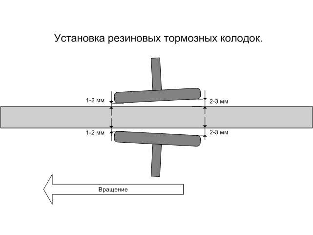 2. Слегка сжимаем тормозную рукоятку, чтобы колодки вплотную приблизились к ободу, и устанавливаем колодку так, чтобы: |